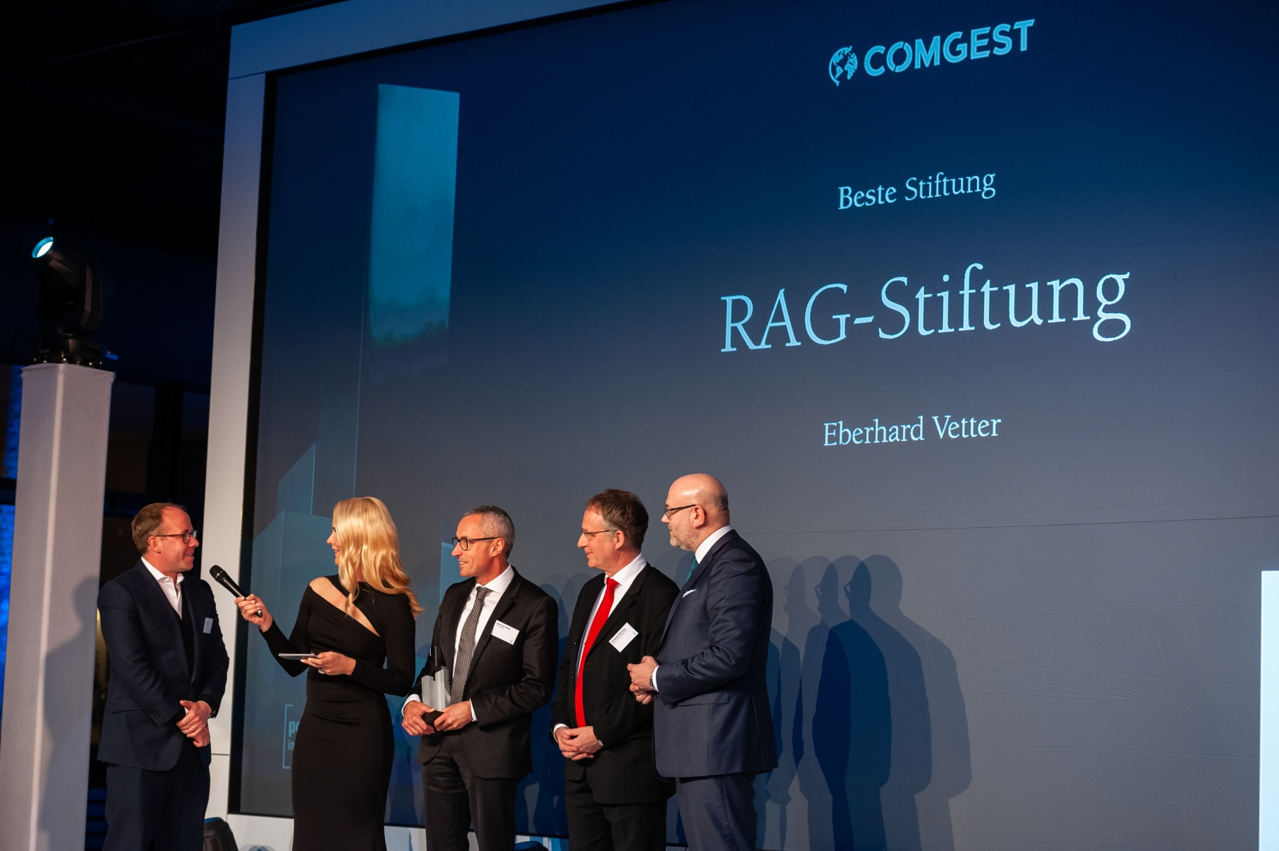 Zu Recht die beste Stiftung 2019: Die RAG-Stiftung, hier vertreten durch Eberhard Vetter (2.v.r.) und Timo Bartell (2.v.l.). Dem Urteil des Juryvertreters Dr. Christoph Mecking (l.) konnte sich der Sponsor Torben Pollitaras,  Comgest Deutschland, nur anschließen. (Bild: Andreas Schwarz)