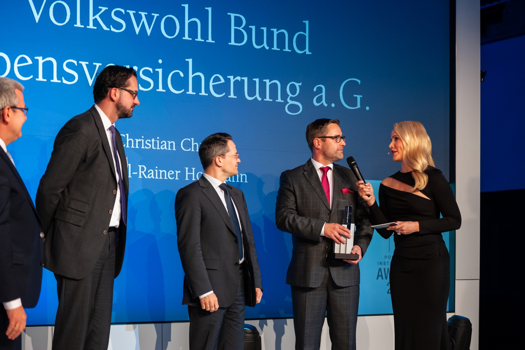 Dr. Karin  Bassler (2.v.r.), die Siegerin des Leserpreises 2019, nimmt den Award aus den Händen von Wolfgang Sussbauer (r.), Vertreter des Sponsors PGIM Fixed Income, entgegen. Moderatorin Judith Rakers und Tim Büttner, Redakteur von portfolio institutionell, gratulierten gebührlich.