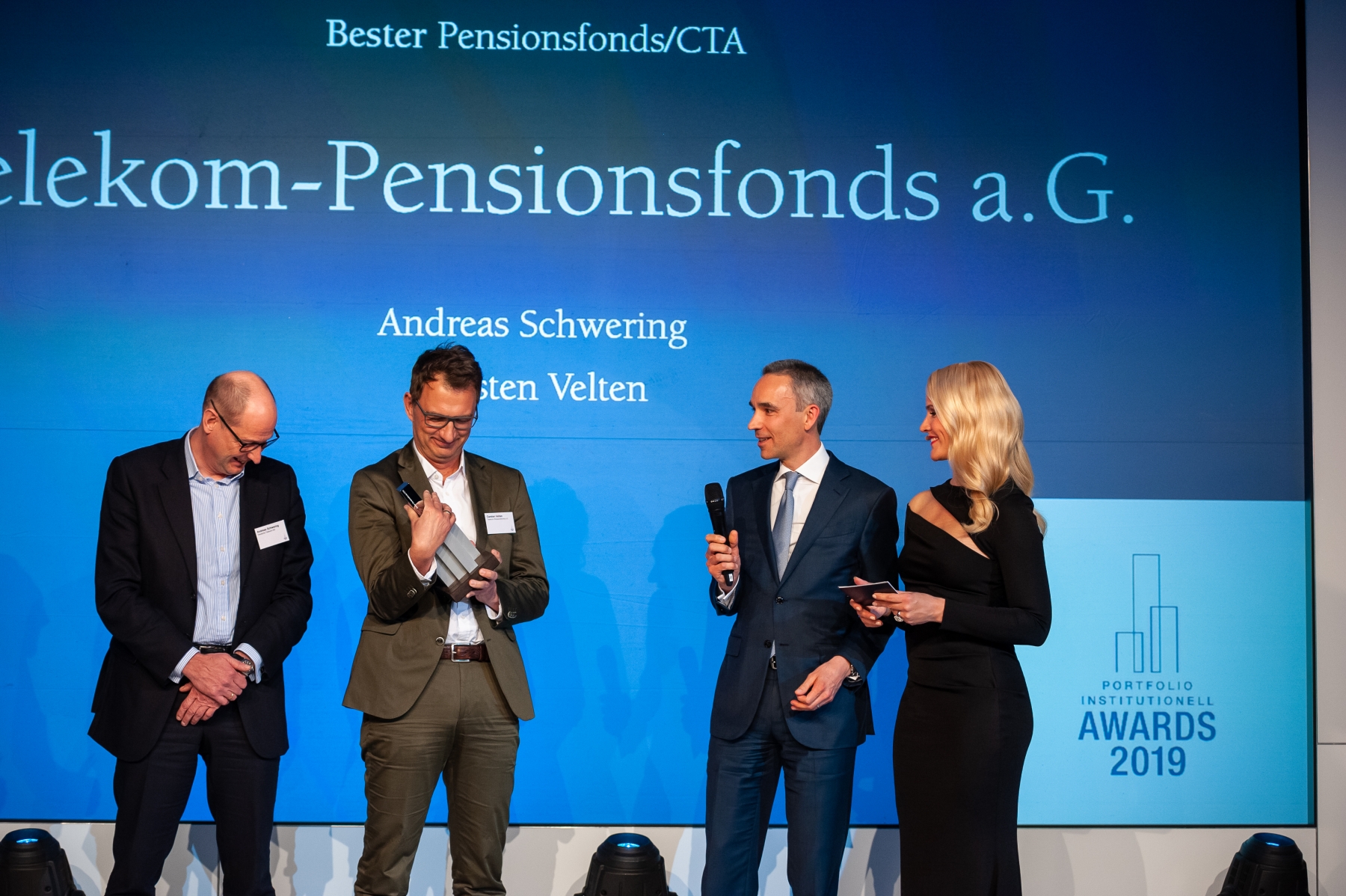 Bester Pensionsfonds 2019: Carsten Velten (2.v.r.) und Andreas Schwering (3.v.r.) vom Telekom Pensionsfonds waren sichtlich überrascht und freudestrahlend zugleich. Jurymitglied Marc Oliver Heine (l.) und Martin Pitzer (r.) von Morgan Stanley gratulierten. (Bild: Andreas Schwarz)